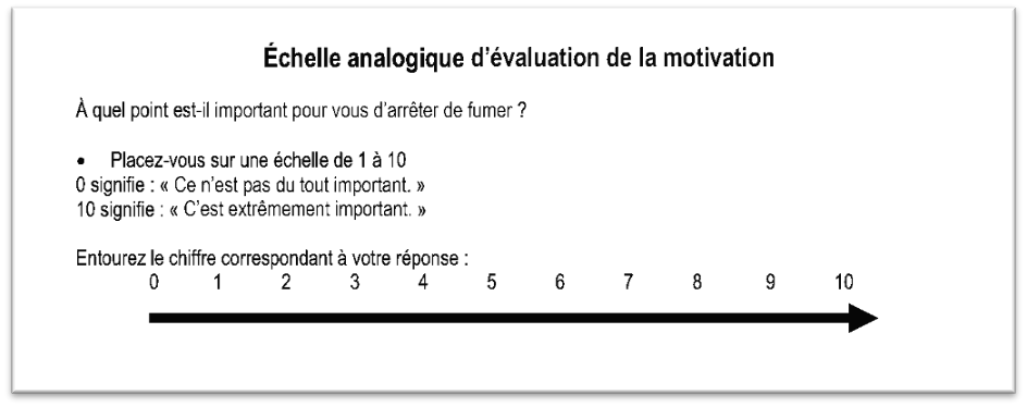 - Le niveau de motivation à l'arrêt peut être évalué à l'aide de l'échelle des modifications de comportement ou une échelle visuelle analogique. Il est recommandé d'adapter son attitude à la motivation et au degré d'ambivalence du patient.