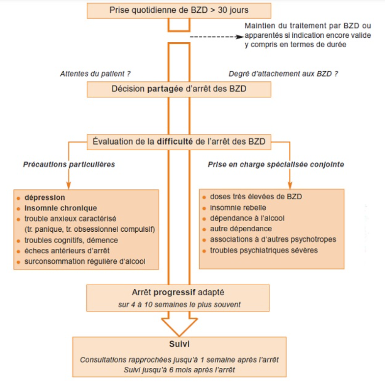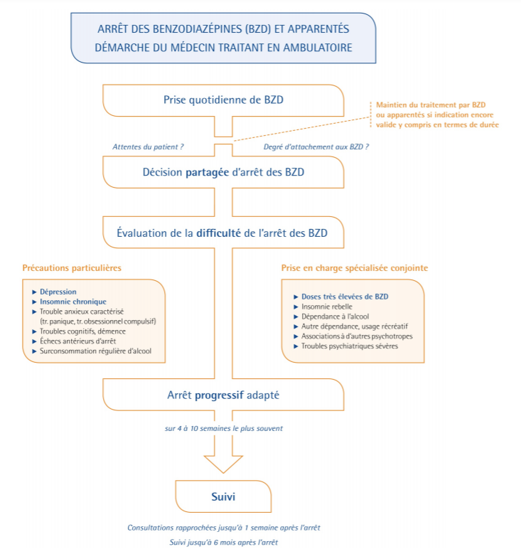 - Si la proposition d'arrêt des benzodiazépines n'est pas acceptée par le patient, il est recommandé de renouveler l'information lors d'une consultation ultérieure.