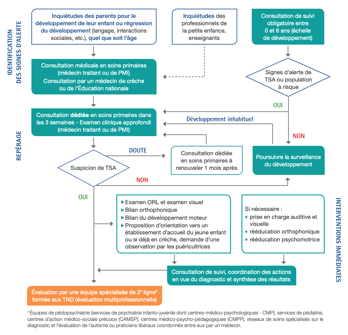 - L'enfant doit être orienté immédiatement vers une consultation à visée diagnostique spécialisée dans les troubles du neurodéveloppement (TND) auprès d'un professionnel de 2e ligne (pédopsychiatre et/ou pédiatre...).