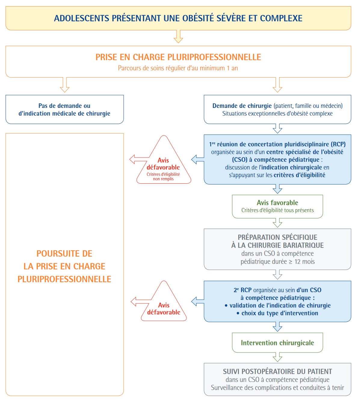 - L'indication d'une chirurgie bariatrique est discutée lors d'une réunion de concertation pluriprofessionnelle (RCP) dans un centre spécialisé de l'obésité (CSO) à compétence pédiatrique, permettant d'évaluer les critères d'éligibilité du patient et la balance bénéfice-risque.
