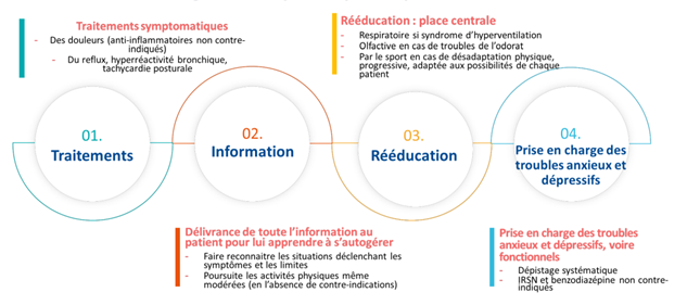 Les 4 axes de la stratégie thérapeutique des symptômes prolongés à la suite d'une Covid-19 ( Figure 1) en premier recours sont :