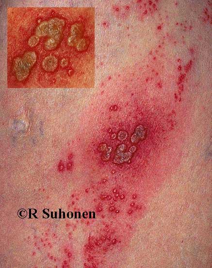 • En 1–2 semaines, les vésicules se transforment en pustules avec croûtes et ulcérations.