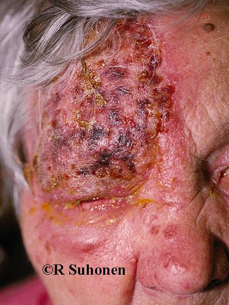 Figure 6. Zona facial chez une femme âgée. Cette maladie provoquée par le virus varicelle-zona est unilatérale, comme c'est la règle.