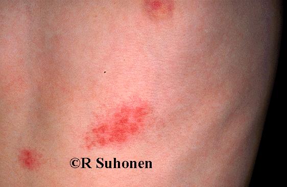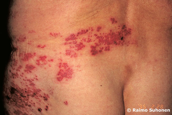 : érythème chaud et clairement défini, éventuellement avec des cloques, généralement de la fièvre, pas tellement douloureux, ne suivant pas les limites des dermatomes