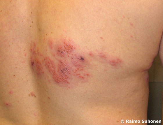 Figure 2. Zona sur le dos. Le zona, ou herpès zoster, apparaît souvent sur le tronc, il est limité par la ligne médiane du corps et circonscrit à la région d’un ou deux dermatomes, mais il peut également survenir sur la fesse, le front, le cuir chevelu, l’oreille, etc. Il arrive souvent que les vésicules saignent. Parfois, quelques vésicules seulement se développent. La sensibilité et la douleur précèdent l’éruption des vésicules.