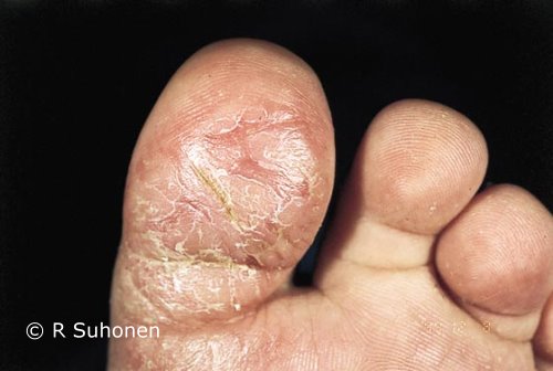 Dermatophytose plantaire. Mycose plantaire, ou « mycose de type mocassin », à gauche sur l’illustration (pied droit). Généralement, les ongles portent également la marque d’altérations dues à la mycose. L’agent causal est T. rubrum.