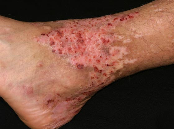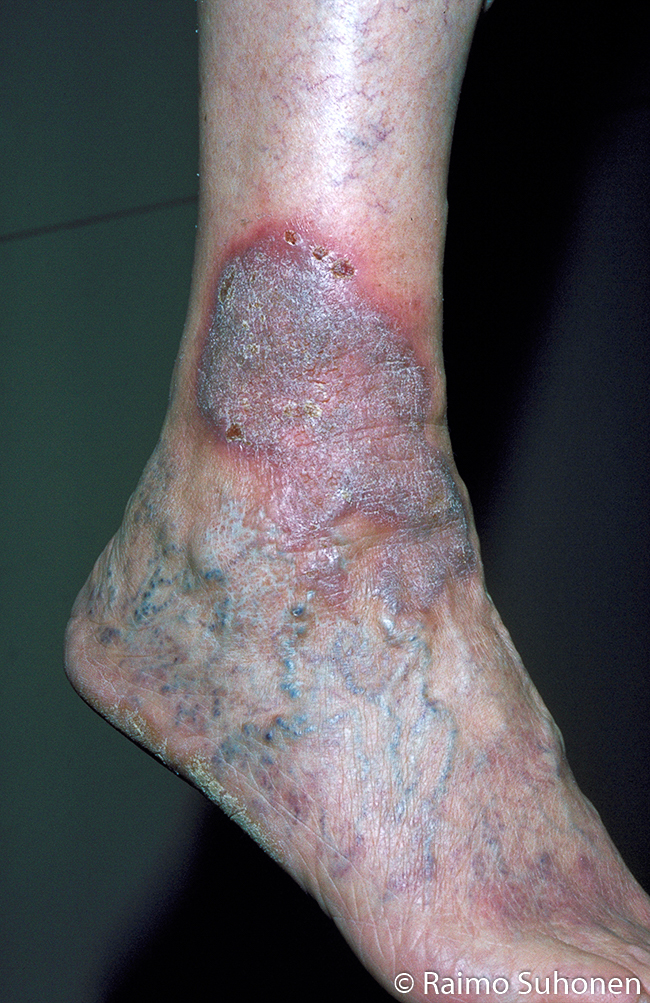 Figure 27. Névrodermite sur la peau de la jambe. Une plaque de névrodermite prurigineuse à son emplacement typique : la peau de la jambe. Les rougeurs, les signes de grattage et la lichénification sont des caractéristiques communes de cette maladie chronique.