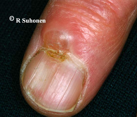 Figure 15. Kyste mucoïde digital.Un kyste mucoïde (ou myxoïde) est un processus dégénératif de la face dorsale l’articulation IDP d’un doigt, associé à l’arthrose. Voir aussi