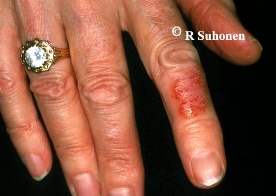 • Habituellement consécutive à une dermatite de contact due à une peau constamment humide et chaude. Les patients souffrent souvent aussi de dermatite atopique.