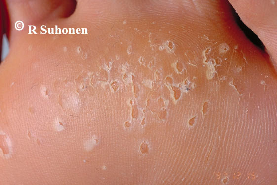 Kératolyse ponctuée au niveau de la plante du pied. Kératolyse ponctuée au niveau de la plante du pied. La transpiration et les chaussures fermées peuvent entraîner une prolifération bactérienne au niveau de la peau plantaire. On peut également soigner les perforations de la peau à l’aide d’antitranspirants contenant du chlorure d’aluminium et en évitant de porter des chaussures fermées. Le principal diagnostic différentiel est la mycose plantaire causée par T. rubrum.