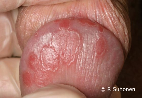 Balanite circinée. Les plaques annulaires sur le gland du pénis sont typiques de la balanite circinée qui est considérée comme l’un des symptômes ​associé aux arthrites réactionnelles. Les lésions cutanées sont traitées avec des dermocorticoïdes, mais d’autres signes possibles ​associés aux arthrites réactionnelles doivent être recherchés.