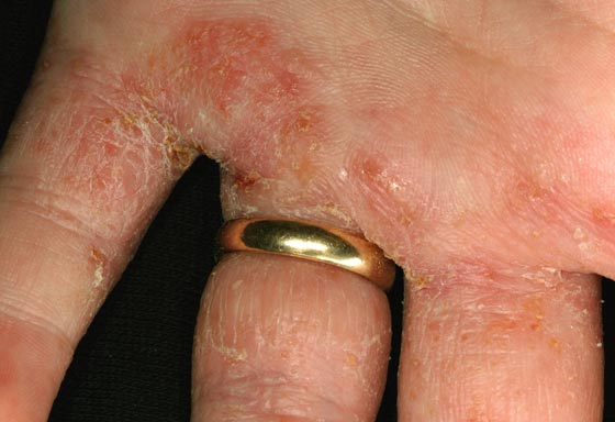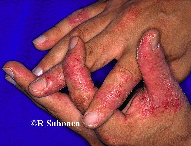 • Une dermatite symétrique des surfaces palmaires chez une personne jeune doit évoquer une dermatite de contact irritative ou une dermatite atopique.