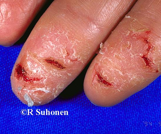 Dermatite du bout des doigts. La dermatite de l'extrémité des doigts est fréquente chez les ​personnes présentant un terrain atopique et régulièrement exposées à l'eau et aux détergents (dans la sphère professionnelle ou privée). Ce tableau clinique est assez résistant au traitement, qui doit associer un corticostéroïde topique puissant à l'utilisation régulière d'émollients et à la protection de la peau contre les irritants.