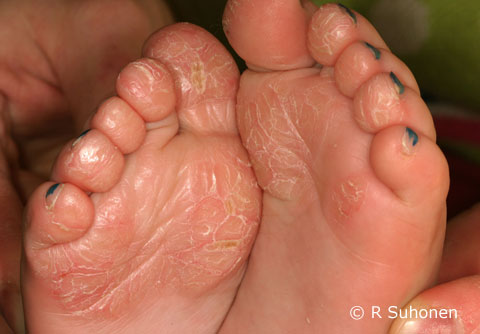 Dermatose plantaire atopique. La dermatose plantaire atopique (d. p. juvénile, «pied d'hiver») est une forme de dermatite atopique chez les jeunes garçons. La plante des pieds est rougeâtre, squameuse et présente souvent des fissures. Les corticoïdes et les émollients sont utiles, jusqu'à ce que ce symptôme disparaisse spontanément au fil des ans. L’allergie de contact est rarement responsable de la dermatite.