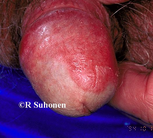 Figure 22. Dermatite séborrhéique sur le pénis. La dermatite séborrhéique est une affection courante, mais largement sous-diagnostiquée, de la région du gland (prépuce).Les diagnostics différentiels incluent l'érythroplasie de Queyrat - la maladie de Bowen de la région du gland - qui ne peut être identifiée que par une biopsie. Le patient atteint d’érythroplasie doit être adressé à un spécialiste afin de recevoir le traitement adéquat.