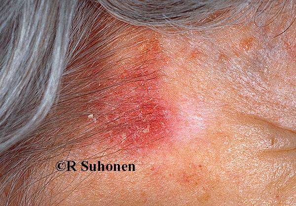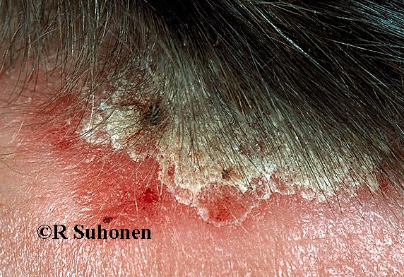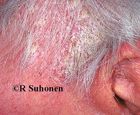 Lésions psoriasiques sur la peau du cuir chevelu. Les lésions psoriasiques cutanées du cuir chevelu sont fréquentes à la lisière des cheveux. Ici, les squames argentées sont exceptionnellement très visibles, même en dehors de la lisière des cheveux. Souvent, comme ici, la zone rougeâtre est plus large que celle de la desquamation. Le diagnostic différentiel entre psoriasis et dermatite séborrhéique est souvent difficile, voire impossible, si seul le cuir chevelu est atteint.