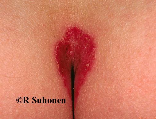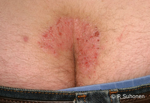 Névrodermite du sillon interfessier. Névrodermite, c’est-à-dire une plaque eczémateuse lichénifiée mal définie dans la partie supérieure du sillon interfessier, résultant d’un cercle vicieux de démangeaisons et de grattage. La peau est abimée par le grattage. L’éruption ressemble à un lichen plan: vérifiez la peau sur d'autres parties du corps (en particulier les poignets, les chevilles et la muqueuse buccale).