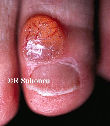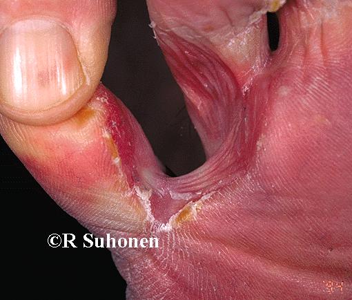 Dermatophytose du pied interdigitale. Dans les environnements chauds et humides, la dermatophytose peut déchirer la peau entre les orteils. Dans ce genre de situation, une infection bactérienne est également présente.