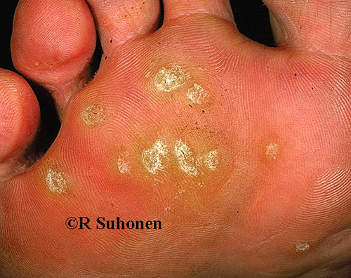 Verrues plantaires. Les verrues plantaires poussent «vers l’intérieur», exercent une pression sur les tissus sous-cutanés et sont même douloureuses à la marche. Une hyperkératose réactive (callosités) se développe autour des verrues.
