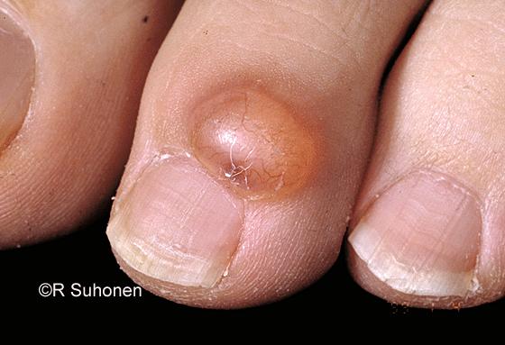 Figure 16. Kyste mucoïde sur un orteil. Kyste mucoïde, dans ce cas exceptionnellement étendu et à paroi fine; translucide. Généralement, le kyste transparent rempli de mucus est relié à l’espace articulaire d’une articulation interphalangienne distale.