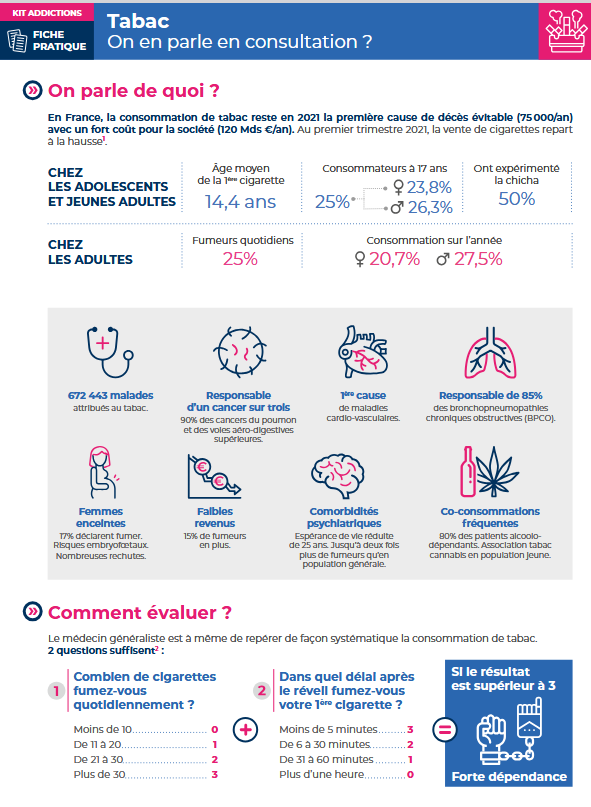 (Re)trouvez également la fiche pratique « Tabac : on en parle en consultation ? » produite par le Collège de la Médecine Générale, dans le cadre du très demandé Kit addictions.